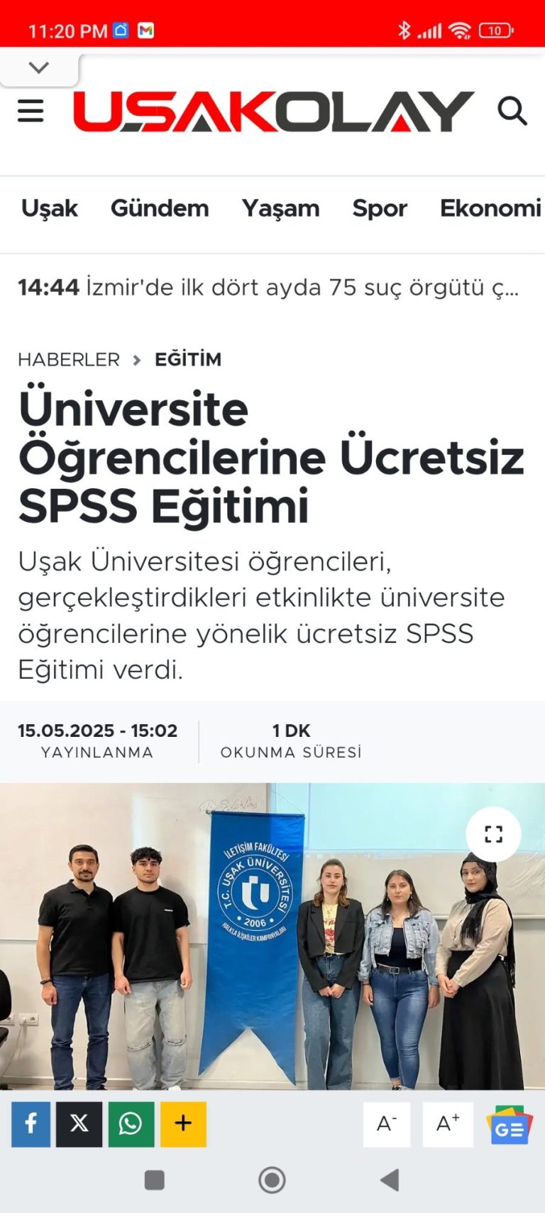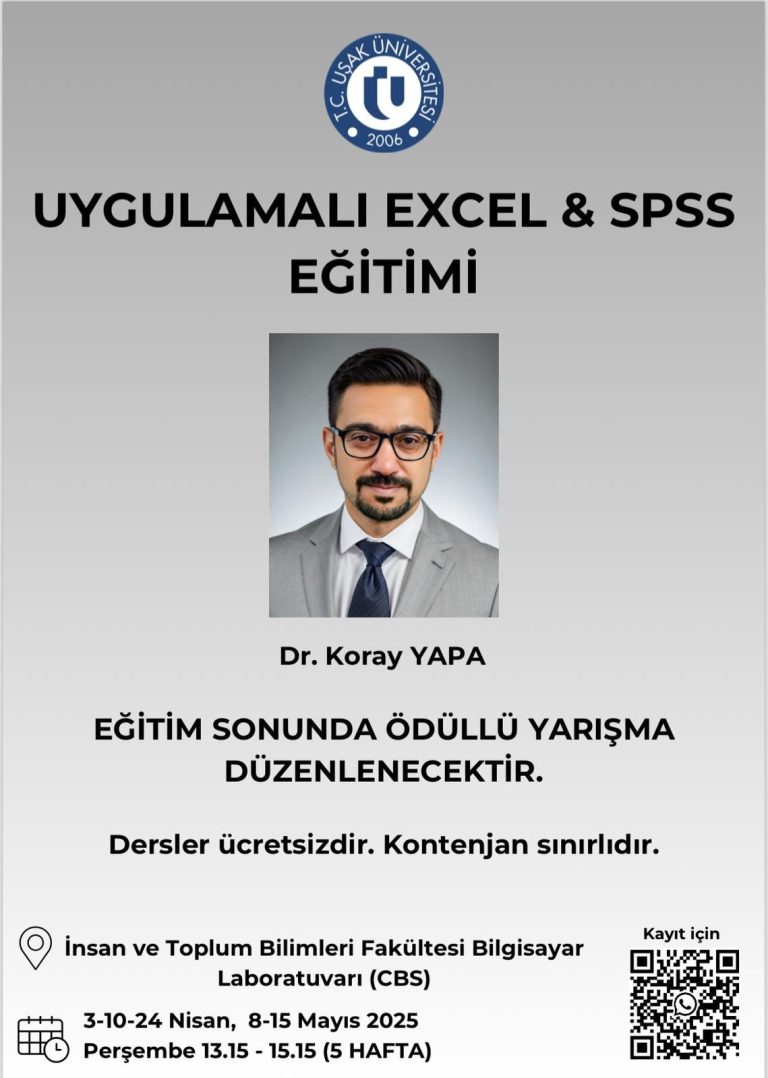 Uşak Üniversitesi İletişim Fakültesi Halkla İlişkiler ve Reklamcılık Bölümü öğrencileri Hülya Sayar, Ebru Elif Taşkın ve İbrahim Çağrı Eryiğit tarafından, halkla ilişkiler dersi kapsamında gerçekleştirilen etkinlikte, üniversite öğrencilerine yönelik 5 hafta süren ücretsiz SPSS Eğitimi düzenlendi. (https://www.usakolay.com/universite-ogrencilerine-ucretsiz-spss-egitimi)